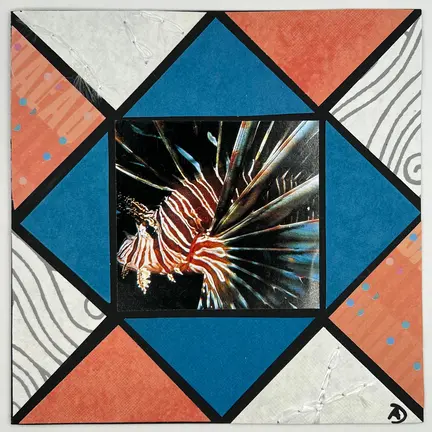 Min nørdede farvesans er herefter gået videre til at finde de helt rigtige farver, der matcher motivet i mine mange håndlavede papirer såvel som specielle papirtyper. Motivet i midten er herefter blevet indrammet med trekanter fra papirer, der fremhæver motivets farver.