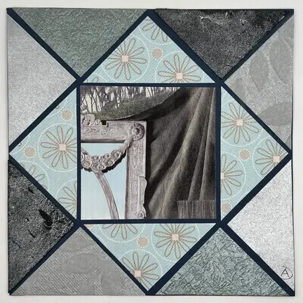 Min nørdede farvesans er herefter gået videre til at finde de helt rigtige farver, der matcher motivet i mine mange håndlavede papirer såvel som specielle papirtyper. Motivet i midten er herefter blevet indrammet med trekanter fra papirer, der fremhæver motivets farver.